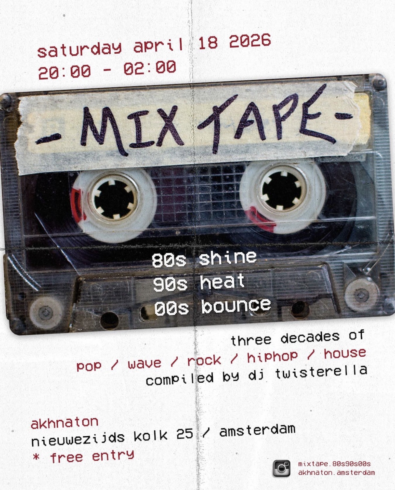 Introducing MIX TAPE in Akhnaton Amsterdam! This night will be filled with decades of Pop, Wave, Rock, Hiphop and House!!Free entry! Come by, have a drink and DANCE!